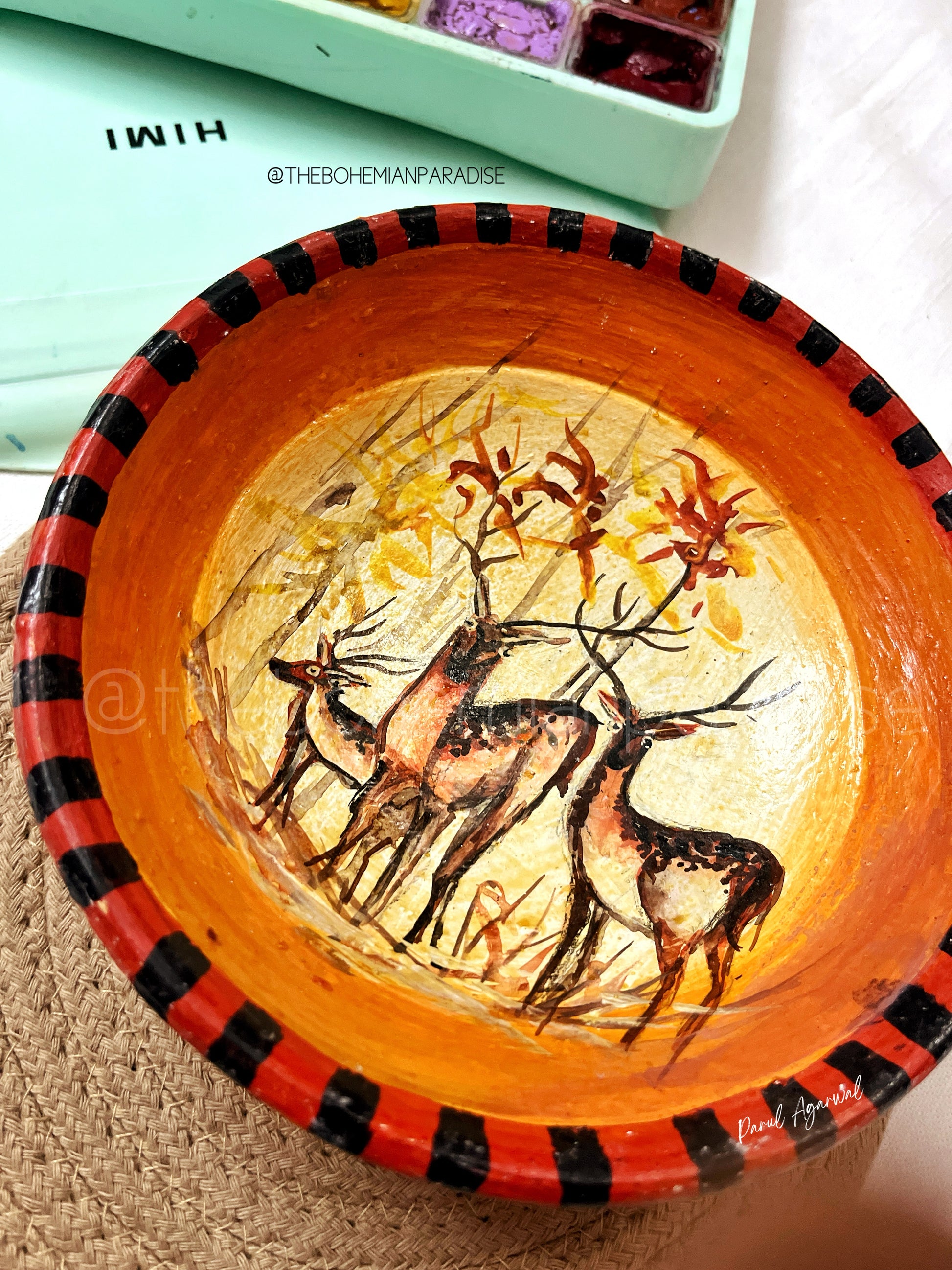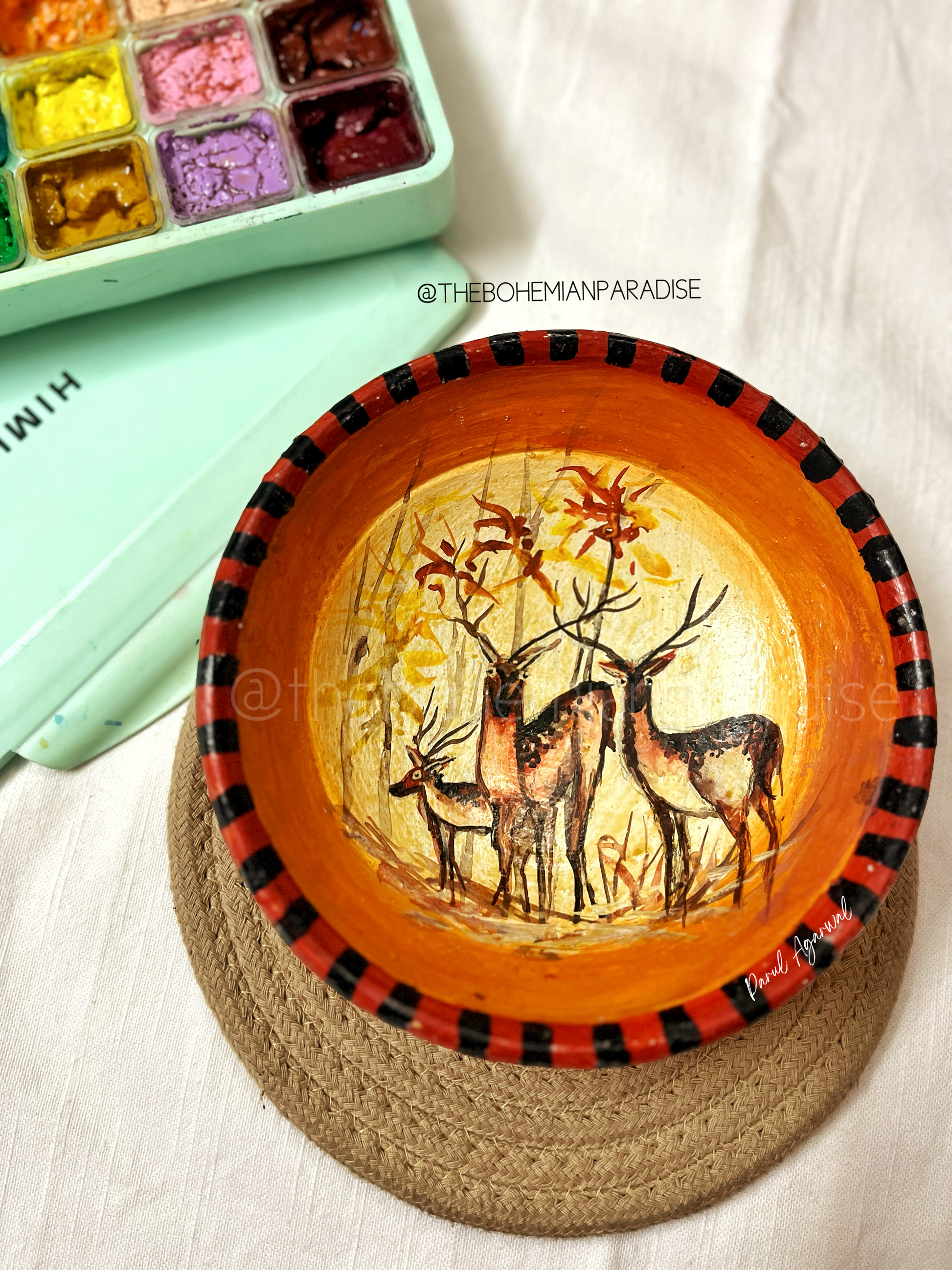 This circular artwork, meticulously painted on a handcrafted clay plate, captures a serene moment of a deer family gathering in an autumn forest. The rich, warm hues of the scene are complemented by the plate’s bold, hand-painted border, enhancing the overall rustic charm. Perfect for nature enthusiasts, this piece can be elegantly hung on a wall or displayed on a stand, bringing the beauty of the wild into your home.