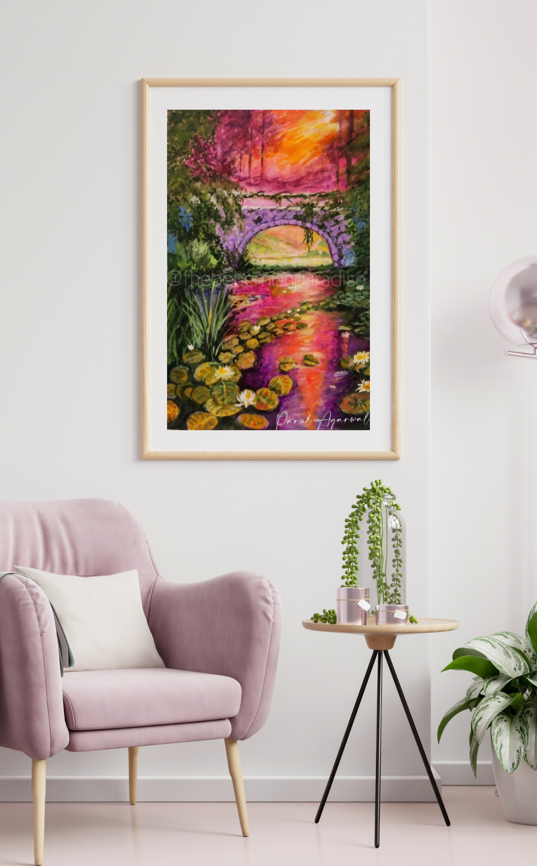 Experience the magic of the golden hour with our stunning gouache painting, 'Golden Hour Reflections.' This captivating artwork showcases a serene pond reflecting the vibrant colors of a sunset, with a charming bridge leading the way. The intricate details and soothing palette create a sense of peace and tranquility. Bring a touch of nature's beauty into your home with this breathtaking piece.
