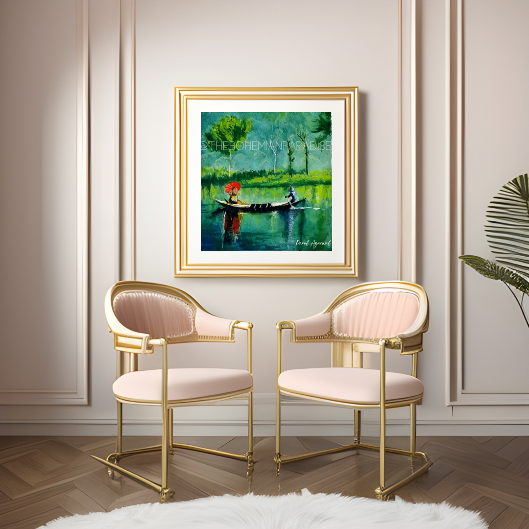 “Harmony Afloat” captures the serene rhythm of life on a tranquil river, where the verdant greens of the landscape meet the reflective calm of the water. Two figures share a quiet journey in a wooden boat, shaded by a vivid red umbrella, creating a harmonious interplay of nature and human connection. The lush foliage and soft ripples in the river evoke a sense of peace and balance, making this artwork a perfect centerpiece for spaces that celebrate tranquility and natural beauty. Let this painting transport you to a place of calm and quiet reflection.