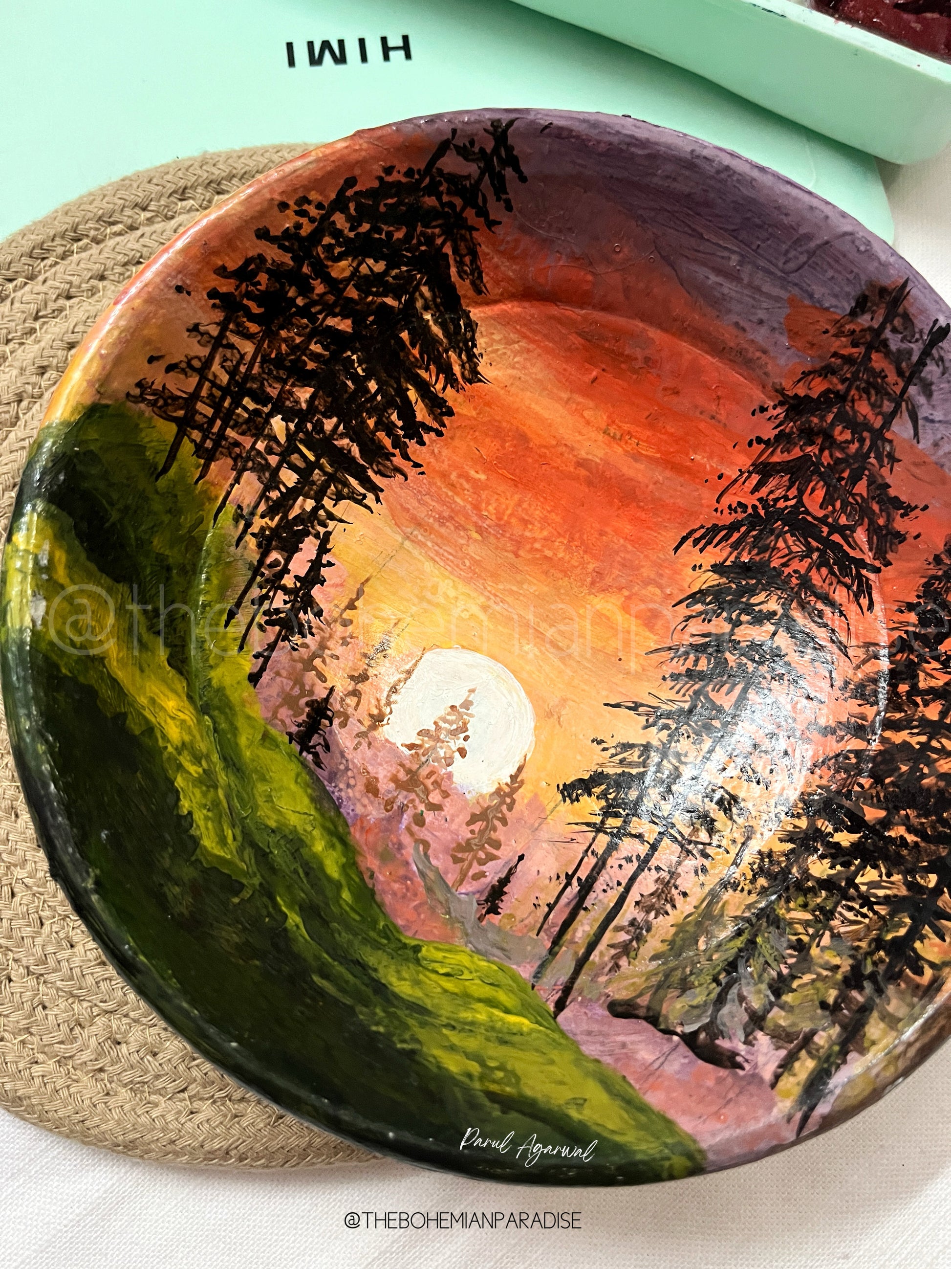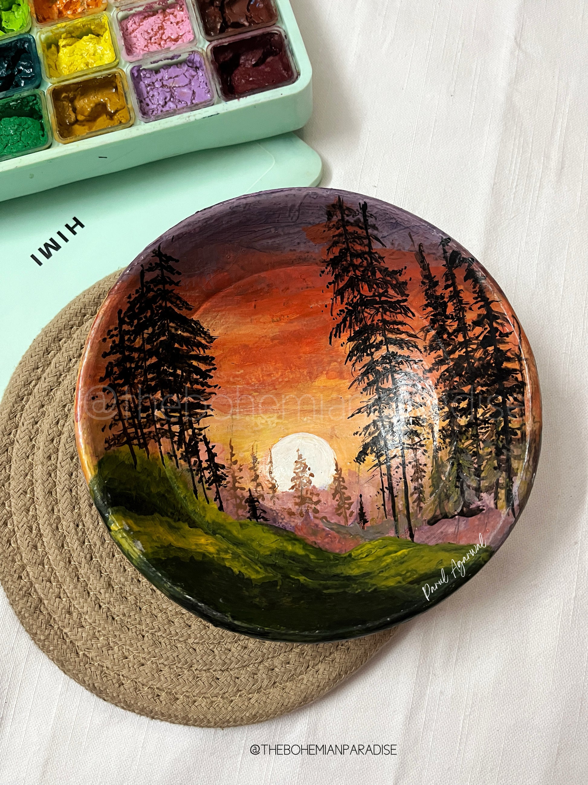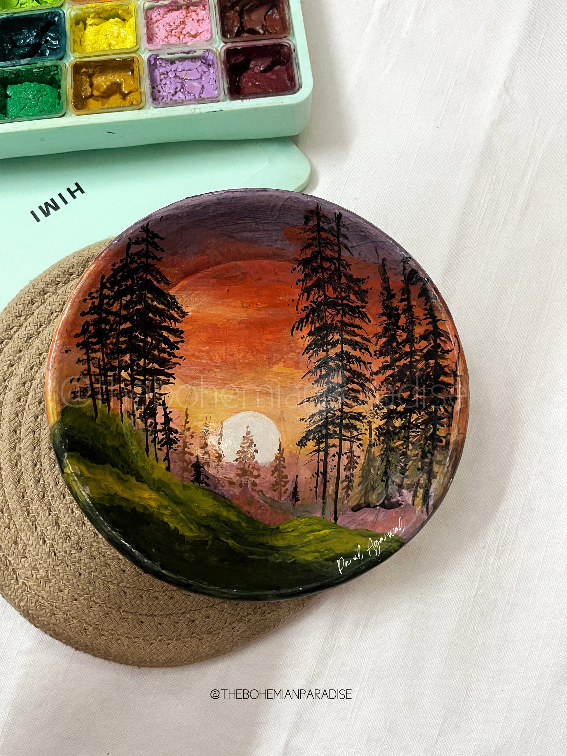 This captivating acrylic painting made on clay plates depicts a serene forest scene bathed in the warm glow of a setting sun. Tall, silhouetted pine trees stand guard against a vibrant sky that transitions from deep orange to soft purple. A full moon rises above the horizon, casting a gentle light on the rolling hills below. The artist's use of color and texture creates a peaceful and meditative atmosphere, inviting the viewer to escape into the tranquility of nature.